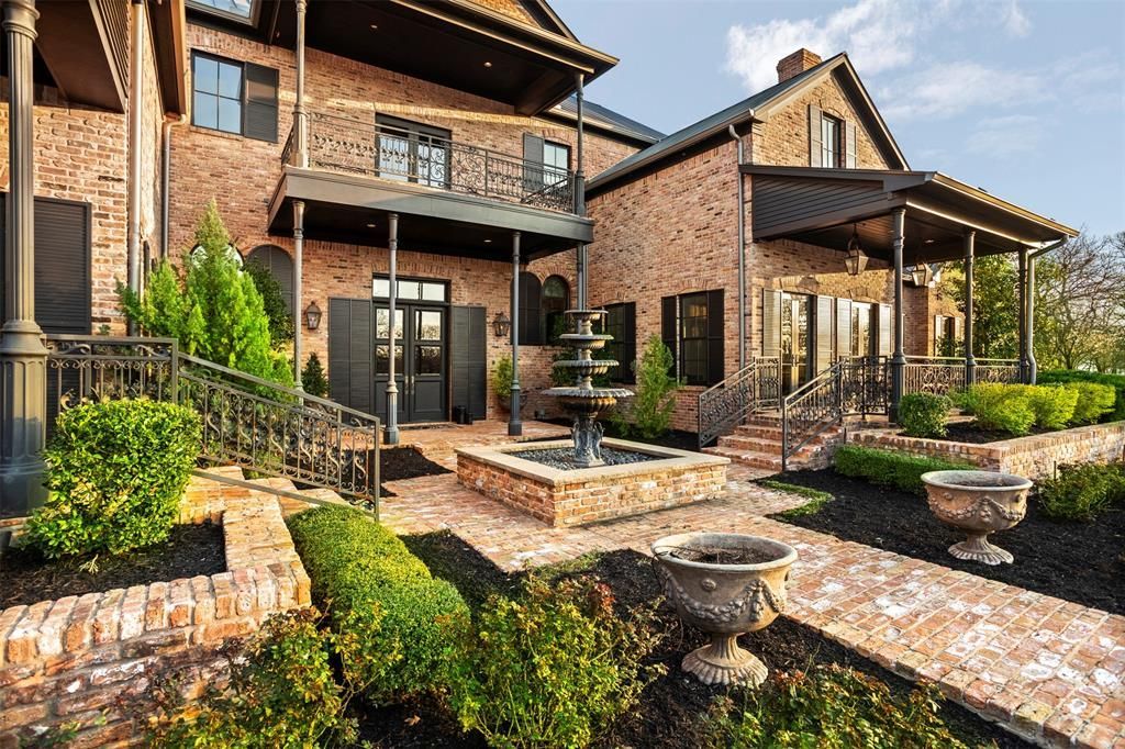 Inspired by the romance and timeless character of the French Quarter, this extraordinary, gated estate on nearly 6 acres offers over 13,000 square feet of living space, blending historic architectural elements with modern luxury. Chicago antique brick spans both the exterior and interior, complemented by antique paver flooring, reclaimed wood floors, and curated antique doors sourced from Paris flea market finds. Statement chandeliers from a historic New Orleans Catholic girls school add a layer of authenticity and charm, while extensive attention to detail is evident throughout. Designed for elevated living and effortless entertaining, the home features Wolf and Sub-Zero appliances, Control4 home automation, and high-end finishes. French Quarter-style balconies and covered patios overlook the resort-inspired pool and spa, creating a private retreat surrounded by lush grounds. Functionality meets efficiency with an attached 6-car garage, air-conditioned storage rooms, and geothermal heating and air. The Party Barn enhances the estate lifestyle and is comprised of three functional areas: a 1,177 sq ft entertainment party room ideal for hosting, a 1,434 sq ft upstairs guest home with 896 sq ft finished including a kitchen and living space, and a 1,863 sq ft workshop-garage offering exceptional flexibility. A rare offering combining European character, New Orleans soul, and Texas scale, this Bartonville estate delivers unparalleled privacy, craftsmanship, and lifestyle.