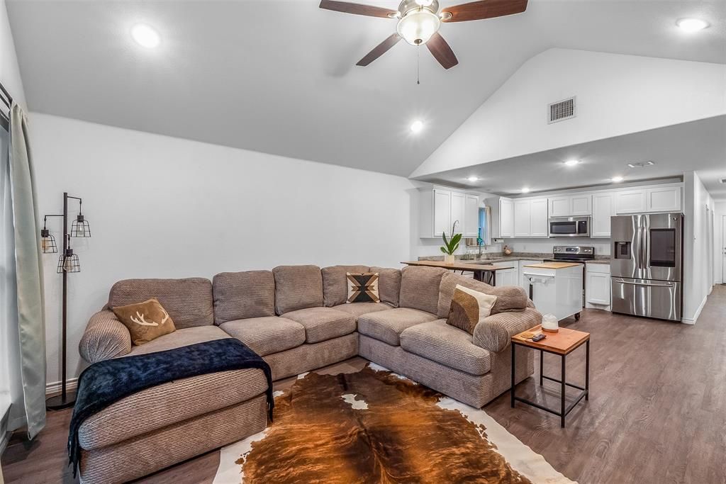 Charming craftsman style 3 bed 2 bath 2021 build, open concept with vaulted ceilings, ample size kitchen features granite surfaces, stainless appliances and walk in pantry, bathrooms include granite surfaces, dual sinks and tub & shower combo, primary bedroom located at back of house has ensuite bath and walk in closet, spacious laundry room with mud room feature. Current owner has repainted the interior, extended the driveway, extended and covered the back porch, installed a garden, added a backyard storage shed, pulled carpet in secondary bedrooms and laid matching flooring, and installed garage workbench and tote storage. Located on quiet street in close proximity to all Cleburne has to offer including quick access to US 67.