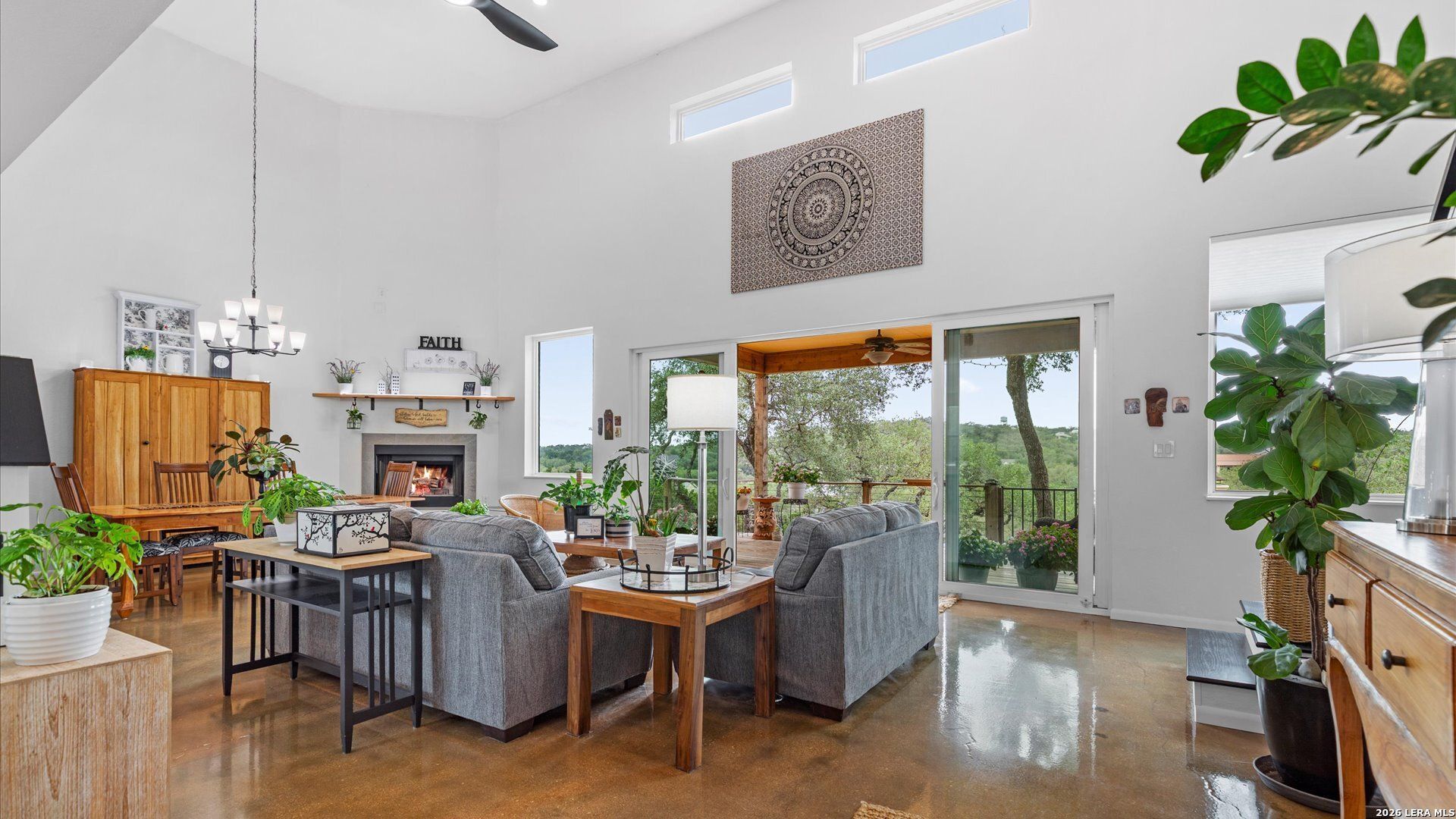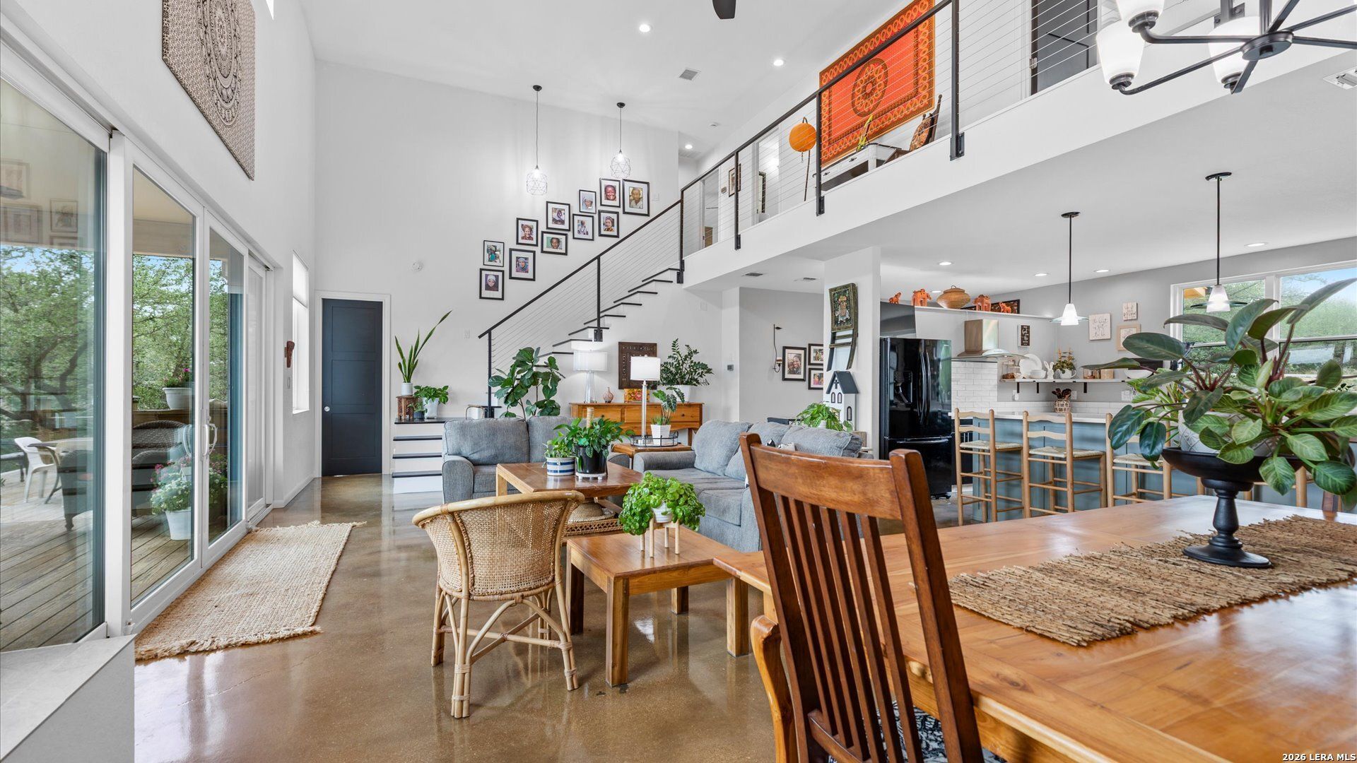 Experience the pinnacle of Hill Country living in this 2,888 sq. ft. Modern Mediterranean retreat. Nestled on a private 1.76-acre lot in the prestigious River Chase community, this 4-bedroom, 2.5-bathroom home features soaring ceilings and sleek stained concrete flooring throughout the main level. The exceptional Hill Country views are a focal point, showcased through massive sliding glass doors that provide a seamless transition to an expansive wooden deck. The gourmet kitchen is an entertainers dream, featuring a large center island, matte black cabinetry, and premium built-in appliances. Retreat to the primary suite, offering a luxury bath with a custom walk-in pebble shower. Structural peace of mind is ensured with a composition roof replaced in 2025 and dual HVAC units. Residents enjoy exclusive access to a 58-acre private park on the Guadalupe River, resort-style pools, and a fitness center, all within the acclaimed Comal ISD.