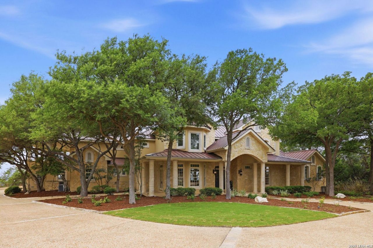 Gated. Private. Unforgettable. Perched on 4.43 pristine acres in a private cul-de-sac, this 6,297 SF showpiece estate delivers a lifestyle most only dream about - complete with panoramic views and Six Flags fireworks from your own backyard every single night. From the moment you pass through the private gate, everything signals something exceptional. A side-entry 3-car garage with abundant storage, a metal roof, mature trees, and stunning exterior lighting set the tone. Inside, three fireplaces anchor the living room, family room, and primary suite. Plantation shutters. Central vacuum. Every finish chosen with intention. The island kitchen is a chefs masterwork: 6-burner Viking gas range, double ovens, built-in GE Cafe refrigerator, double-drawer dishwasher, granite counters with Chicago brick backsplash, wine refrigerator, large walk-in pantry, and a dedicated butlers pantry. Storage and counter space that will make every cook feel at home. The primary suite is its own world - fireplace, sitting area, private patio access, ensuite with soaking tub, triple-head shower, separate vanities, and a barreled-ceiling walk-in closet of remarkable scale. Every additional bedroom has its own ensuite bath. The second-floor balcony frames sweeping views you will never tire of. Outside, the private resort begins. A spectacular pool and hot tub anchor the backyard, fed by a dramatic waterfall cascading down from the patio. The outdoor living area is fully loaded: bar, dedicated refrigerator, Egg smoker, gas grill, and Evo flat top griddle - all shielded by automatic patio shades. The lighted pickleball/basketball court keeps the competition going well after dark. Inside, the fun continues. A gameroom/media room with wet bar, refrigerator, and patio access. A separate game room complete with air hockey and shuffleboard. A dedicated audio/video and storage room keeps every system perfectly managed. Utility room with sink, cabinetry, and counters. Washer, dryer, and extra refrigerator included. The home functions as beautifully as it impresses. Private, yet minutes from the city, premier shopping, dining, and the Hill Country charm of Boerne. This is not just a home - it is an experience. Welcome to 6730 Wagner Way.