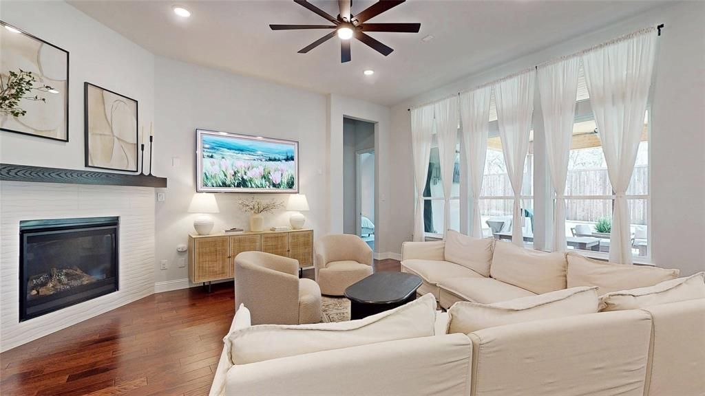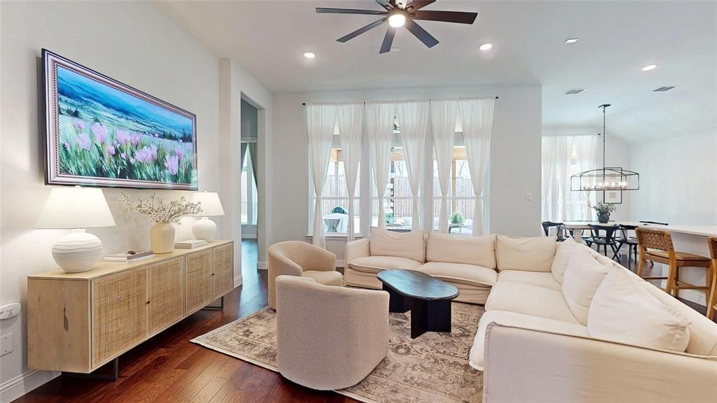 Meticulously maintained single-story in Canyon Falls with immaculate landscaping and beautiful stucco elevation! Terrific location on a quiet interior homesite in the back of the community! Inside you will find 4 bedrooms, 3 full baths, dedicated study with French doors, flex space that makes a perfect second living area or formal dining, and 2-car garage! Fourth bedroom with ensuite bath is perfect for guests! Upgrades and amenities include rich hardwood flooring flowing throughout main living areas, designer paint tones throughout, shutters across the front windows of the home, upgraded lighting fixtures, dry bar-butler's pantry space just off the living room and kitchen ideal for entertaining, split secondary bedrooms for added privacy, and MORE! Primary retreat secluded at the rear of the home offers a luxurious ensuite with dual sink vanity, frameless shower, garden tub, and large walk-in closet. Private backyard is complete with an expansive covered patio area plumbed for gas, 8ft fencing, and huge yard! Come experience the endless amenities Canyon Falls has to offer! Clubhouse with fitness center, community pools and splash pads, pocket parks and playgrounds, miles of walking trails, and MORE!